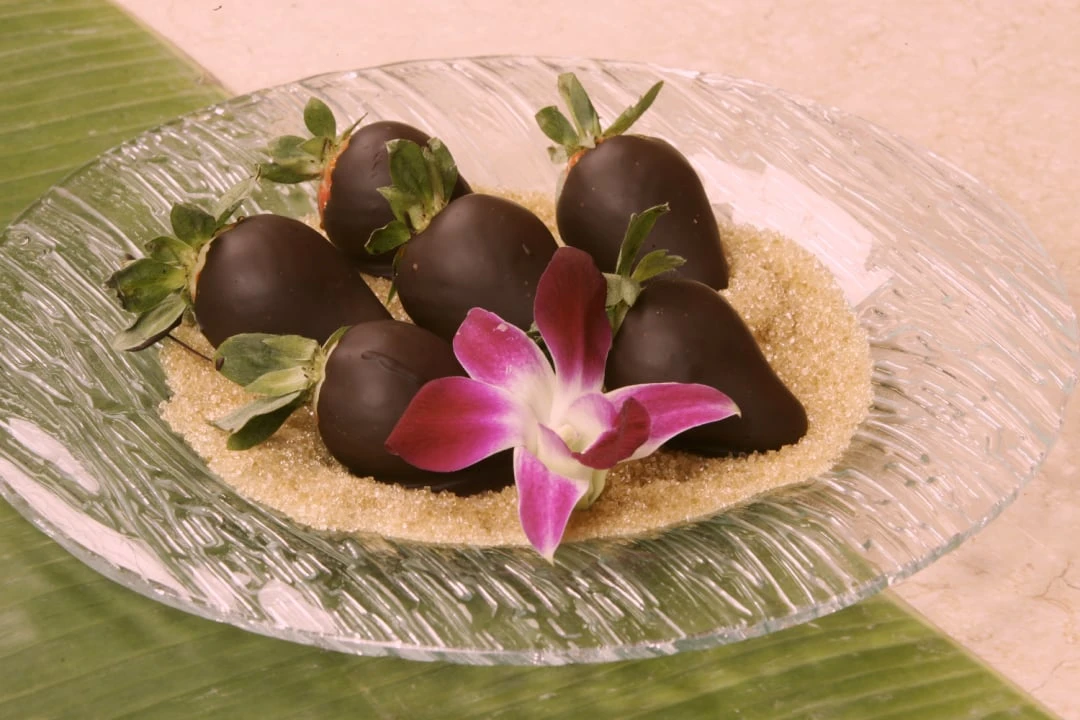 Šest jahod máčených v čokoládě na hnědém cukrovém písku390 KČ